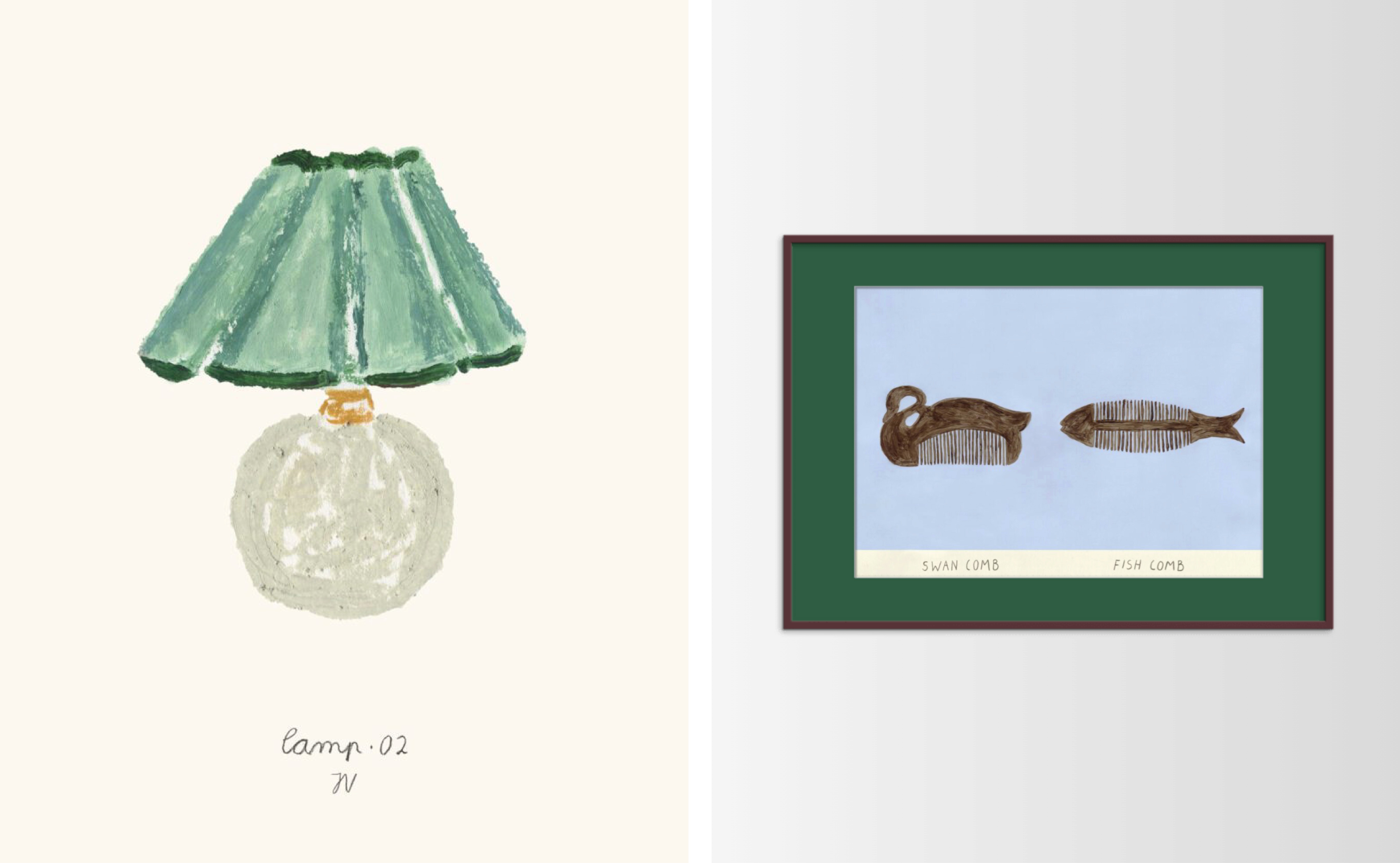 I work from a dedicated room at home, which connects to our living area. My desk with my iMac, a big window and I have two cabinets — one for books and bits I collect, another for art supplies and stored artwork. The space still feels very calm and organized, it’s become a very comforting place to create.